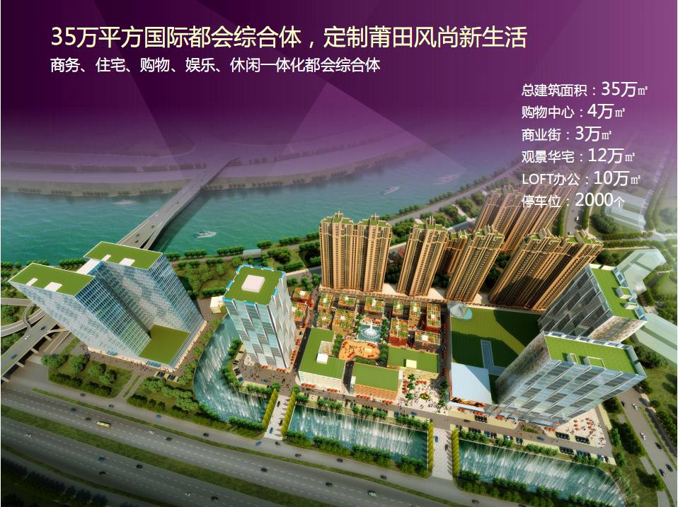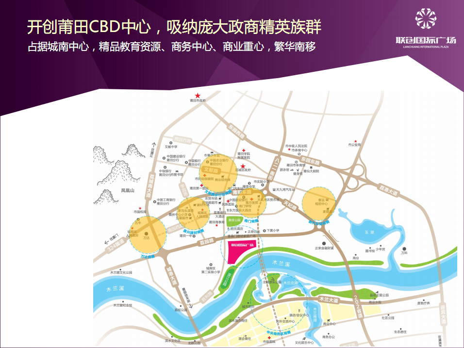 中国500强福建能源集团携手香港联创世纪实力打造,整合两岸三地优势资源,借鉴上海新天地、北京三里屯等国际知名案例,在木兰溪畔打造新一代城市综合体,打造莆田的国际品质“公园城市综合体”——“联创国际广场”。